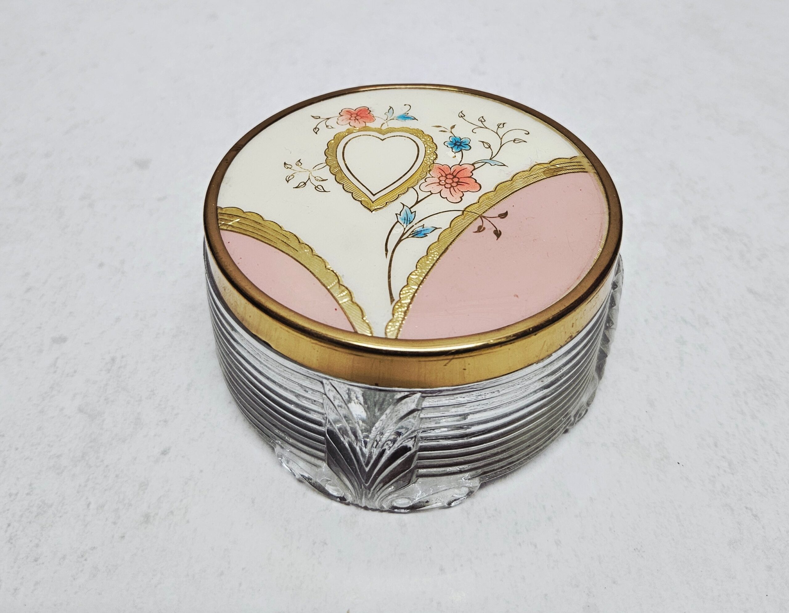 Hierdie is ’n helder geribde glas poeiervat met ’n ornate deksel versier met ’n goue rand, blompatrone en ’n sentrale hart. ’n Tydlose stuk wat die sjarme van vintage selfversorging en dekor na enige moderne ruimte bring.