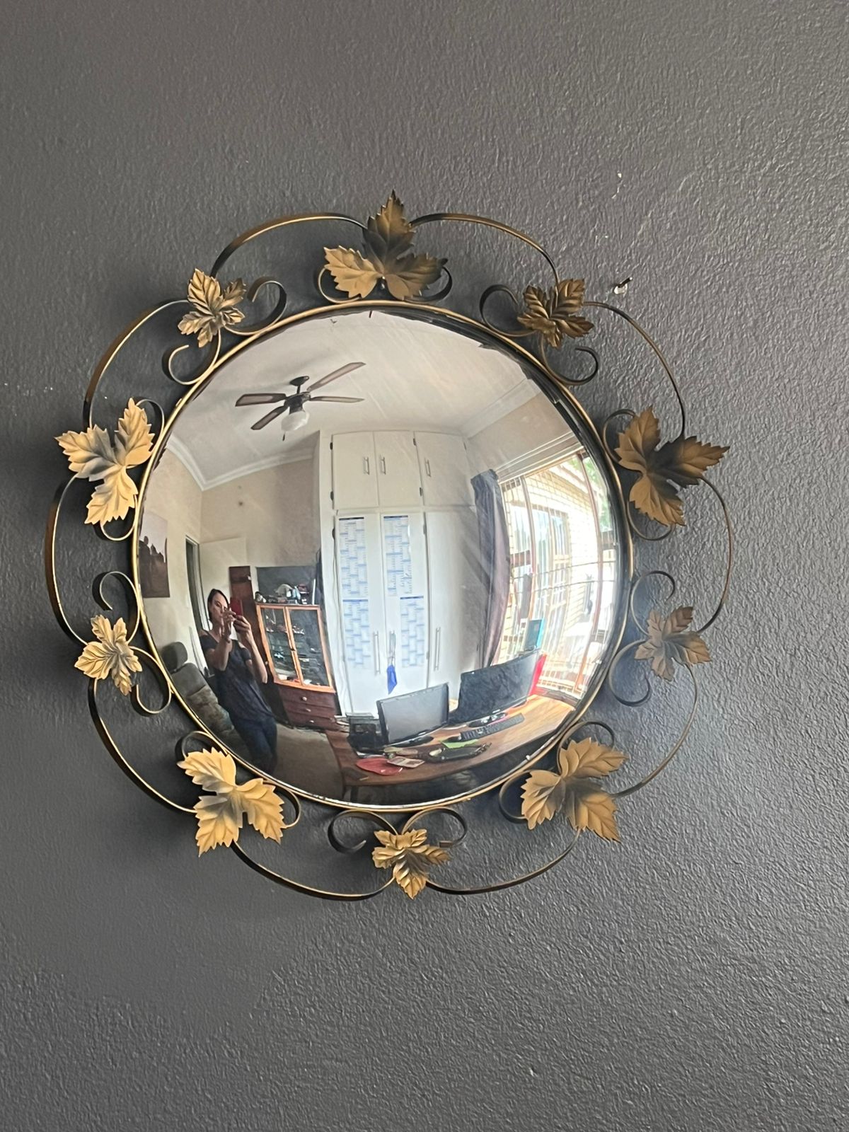 ’n Ronde spieël met sierlike metaalblare en vloeiende krulle wat ’n gevoel van natuur en nostalgie bring. ’n Mid-century dekorstuk wat lig en ruimte verdiep, ideaal vir ’n sitkamer of gastehuis waar vintage warmte gesoek word.
